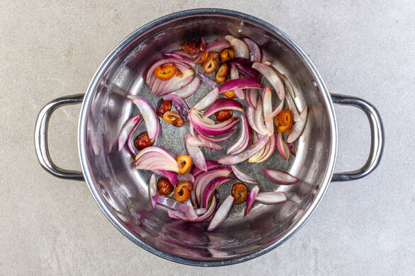Die Zwiebeln und die getrockneten Datteln in einem großen Topf mit 1½EL Olivenöl bei mittlerer Hitze 2–3Min. braten, bis die Zwiebeln zu bräunen beginnen.