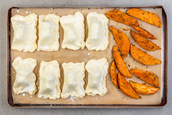 Nach 10Min. Backzeit das Blech aus dem Ofen nehmen und die Süßkartoffelspalten wenden. Die Wurst Bites auf ein zweites mit Backpapier ausgelegtes Blech legen und alles 20–25Min. backen, bis die Wurst Bites und die Süßkartoffeln goldbraun und knusprig sind. Je nach Ofen die Position der Bleche nach der Hälfte der Zeit tauschen.