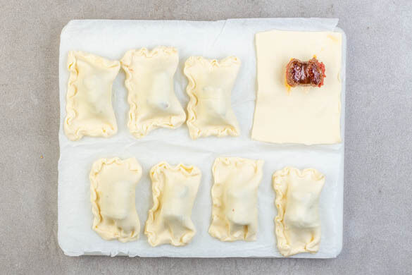 Den Teig mit dem Papier nach unten ausrollen und in 8 gleich große Quadrate schneiden. Jeweils 1 Wurststück in die Mitte eines Quadrates geben und den Teig umklappen. Die Wurst Bites mit 2EL Milch bestreichen.