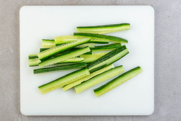 Die Gurke quer halbieren und jede Hälfte der Länge nach in dünne Sticks schneiden. Die Wurst Bites mit den Süßkartoffeln und den Gurken anrichten und mit dem Dip servieren.
