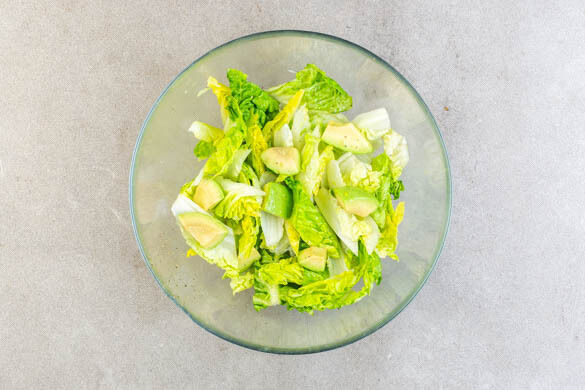 In a salad bowl, mix 2Tbsp olive oil, 1Tbsp vinegar and a pinch of salt and pepper to a vinaigrette. Halve, decore and roughly chop the romana lettuces. Halve the avocado, remove the pit and score the flesh crosswise. Use a spoon to scoop the avocado cubes out of the skin. Toss the salad and the avocado in the vinaigrette.