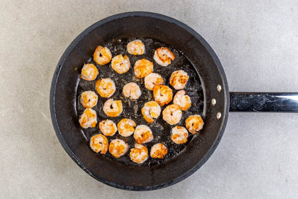 Rinse the shrimp in a sieve with cold water, then pat dry. Add ½Tbsp olive oil to the pan and let come to a medium-high heat. Fry the shrimps on each side for 1–2min. until they turn pink. Be careful to not overcook the shrimps. Season with the rest of the lime juice and a pinch of salt.