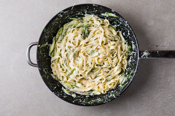 Frühlingszeit ist Spargelzeit! Das Gemüse findet sich von April bis Ende Juni auf den Wochenmärkten. Beim grünen Spargel muss bei der Zubereitung nur das untere holzige Ende entfernt werden, das Schälen entfällt. Der Spargel schmeckt großartig in dieser schnellen Pasta mit Trüffelpulver, Basilikum und Petersilie – probier es aus!