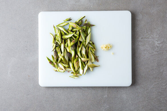 In einem großen Topf ausreichend gesalzenes Wasser für die Pasta zum Kochen bringen. Die hölzernen Enden des Spargels abschneiden, die Stangen längs halbieren und dann schräg in 1–2cm große Stücke schneiden. Den Knoblauch schälen und fein würfeln.