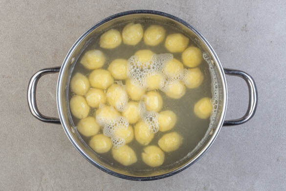 Die Gnocchi in das kochende Wasser geben und 2–3Min. kochen lassen, bis sie gar sind und an der Oberfläche schwimmen.