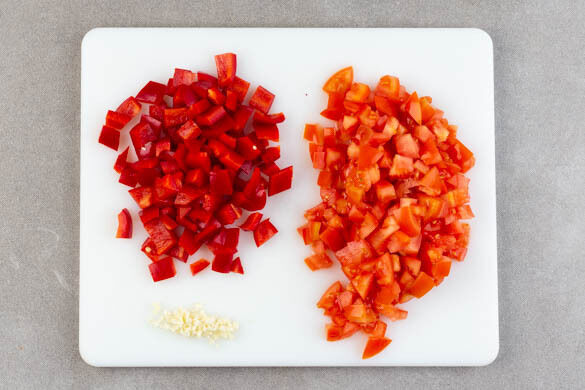 Inzwischen 350ml Wasser in einem Wasserkocher aufkochen. Tipp: Die nach Wasserkocher variierende Mindestmenge beachten und ggf. mehr Wasser aufkochen. Die Paprika vierteln, entkernen und in 1–2cm große Stücke schneiden. Die Tomaten in gleich große Stücke schneiden. Den Knoblauch schälen und fein würfeln, dann in die Pfanne geben und ca. 1Min. mitbraten.