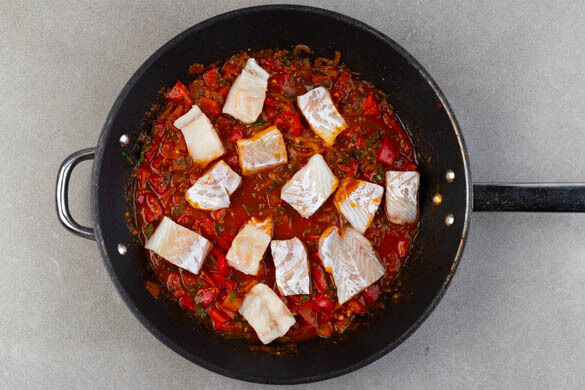 Sanftes Pochieren ist eine köstliche Art, Fisch zuzubereiten. Vor allem wenn der Alaska-Seelachs wie hier in einer fruchtig-würzigen Tomatensauce mit Paprika und Zwiebeln garen darf. Auf lockerem Bulgur mit frischem Schnittlauch und Petersilie serviert, ist dies ein leichtes Vergnügen – nicht nur in der Küche, sondern auch im Bauch! Das Rezept ergibt bei einem 2-Port.-Plan 3, bei einem 4-Port.-Plan 6 Portionen.