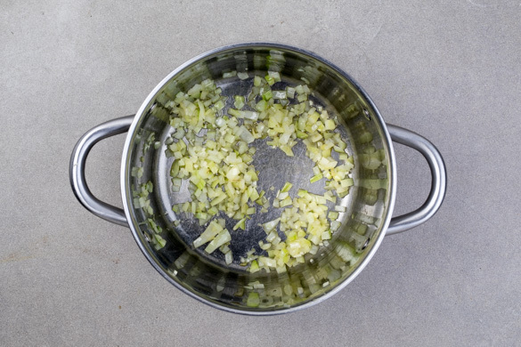 Die Zwiebeln in einem großen Topf mit 2EL Olivenöl bei mittlerer Hitze 2–3Min. glasig anbraten. Den Knoblauch hinzugeben und kurz mitbraten.