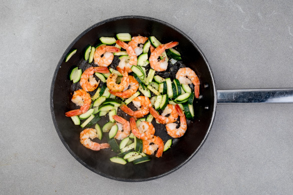 Die Zucchini in einer großen Pfanne mit 2EL Olivenöl bei starker Hitze 2–3Min. anbraten. Die Garnelen dazugeben und 1–2Min. mitbraten. Nach Geschmack mit der Zitronenschale, dem Zitronensaft sowie Salz und Pfeffer würzen und alles noch 1–2Min. bei niedriger Hitze sanft köcheln lassen.