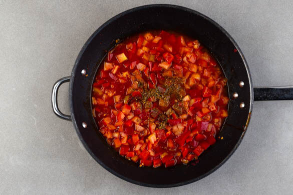 Die Paprika, die Tomaten, die Gewürzmischung, 1TL Zucker, 1 kräftige Prise Salz und das aufgekochte Wasser in die Pfanne geben und zum Kochen bringen, dann bei mittlerer Hitze ca. 12Min. köcheln lassen, bis die Sauce die gewünschte Konsistenz hat.