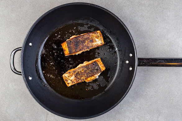 Den Fisch in einer zweiten Pfanne mit 2EL Olivenöl auf der Hautseite bei mittlerer bis starker Hitze 3–4Min. anbraten, damit die Haut schön kross wird. Dann vorsichtig wenden, die Hitze reduzieren und den Fisch in 2–3Min. gar ziehen lassen.