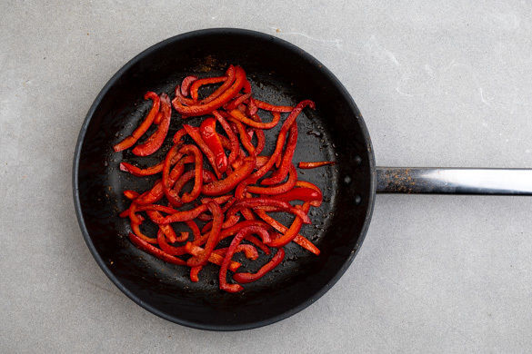 Die Paprika vierteln, entkernen und in dünne Streifen schneiden. In einer großen Pfanne mit 1EL Olivenöl bei mittlerer Hitze 3–5Min. braten. Die übrige Gewürzmischung dazugeben und weitere 2Min. braten.