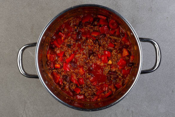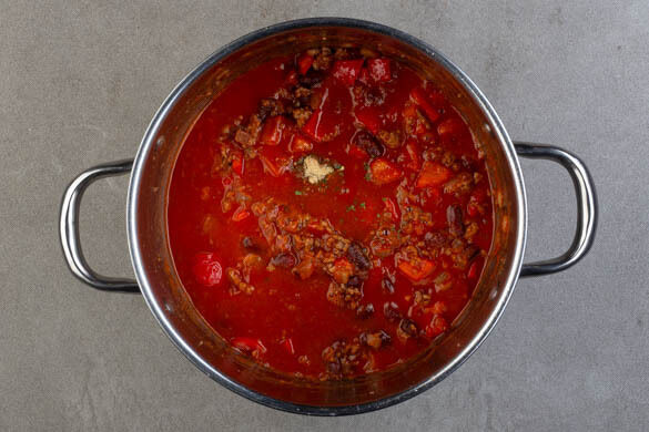 150ml heißes Wasser und das Brühgewürz unterrühren und das Chili ca. 15Min. sanft einköcheln lassen.