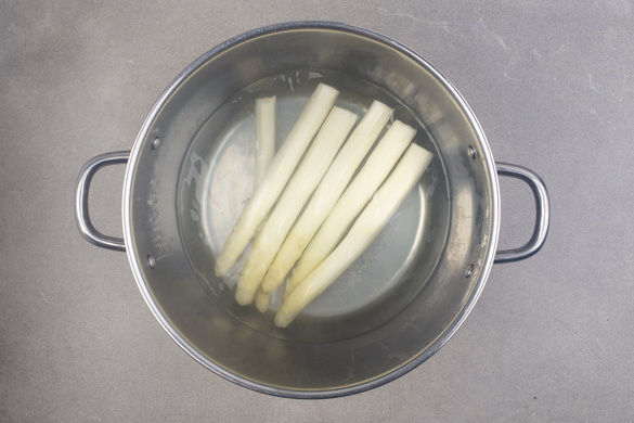 Den Spargel ca. 2cm vom Kopf an abwärts schälen und die holzigen Enden abschneiden.