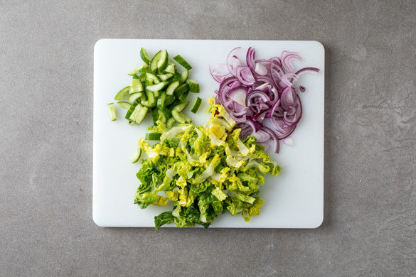Die Gurken der Länge nach vierteln und die Kerne mit einem kleinen Löffel herauskratzen, dann die Gurken in dünne Scheiben schneiden. Den Romanasalat in dünne Streifen schneiden, dabei den Strunk entfernen. Die Zwiebel schälen, halbieren und in feine Streifen schneiden.