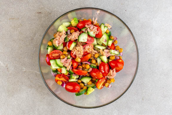 Den Thunfisch abtropfen lassen und mit dem Gemüse verrühren. Die Kichererbsen hinzugeben und erneut verrühren, um alles gleichmäßig mit dem Dressing zu überziehen.