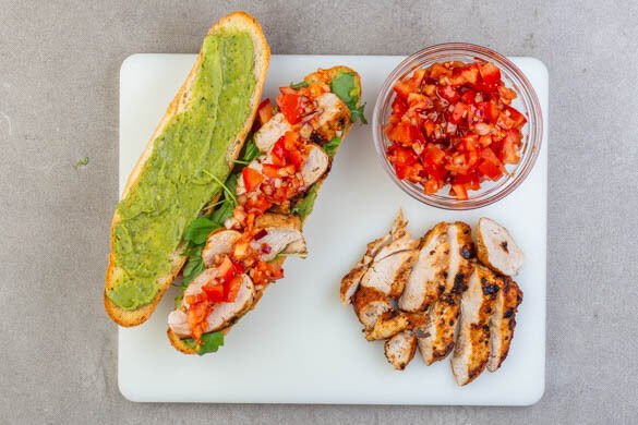 Dieses Sandwich ist prall gefüllt mit saftig gebratenem Hähnchenfleisch, cremiger Guacamole, würzigem Rucola und frischer Tomatensalsa. Die Baguettebrötchen werden zunächst von außen auf dem Toaster kurz angeknuspert und anschließend mit ihren Schnittflächen im aromatischen Bratfett des Hähnchens goldbraun angeröstet. Lass es dir schmecken!