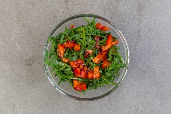 Die Tomaten in kleine Würfel schneiden. Die Zwiebel schälen, halbieren und fein würfeln. Die Tomaten und die ½ der Zwiebeln oder nach Geschmack mehr mit der restlichen Gewürzmischung, 2EL Ketchup und 1TL Zitronenschale vermengen und die Salsa mit Salz und Pfeffer abschmecken.