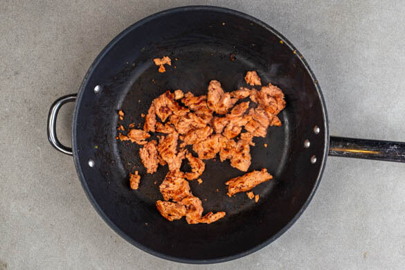 Den Mais aus der Pfanne nehmen. Das vegane Hack in der Pfanne mit ½EL Pflanzenöl bei mittlerer Hitze 5–7Min. goldbraun braten.