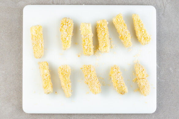 Auf einem tiefen Teller 4EL Mehl mit 1EL Wasser glatt rühren. Auf einem zweiten Teller das Panko-Paniermehl bereitstellen. Den Grillkäse in ca. 1,5cm dicke Stifte schneiden und nacheinander im Teig und im Paniermehl wenden, dabei das Paniermehl ggf. leicht andrücken.