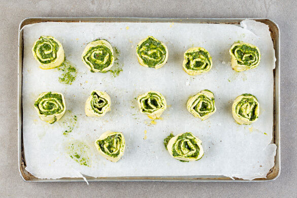 Die Teigrolle in ca. 4cm dicke Scheiben schneiden und diese gleichmäßig auf dem Backpapier verteilen. Auf ein Backblech ziehen und die Miniböreks im Ofen in 14–16Min. goldbraun und knusprig backen. Tipp: Wer mag, kann die Miniböreks vor dem Backen mit verquirltem Ei bestreichen.