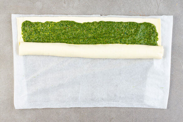 Den Backofen auf 220°C /200°C Umluft) vorheizen. Die Zwiebel schälen, halbieren und in dünne Streifen schneiden. Mit dem Spinat in einer großen Pfanne mit 1EL Pflanzenöl bei starker Hitze 2–3Min. anbraten. Herausnehmen und mit 1EL Harissa und ½TL Salz pürieren, dann den Käse unterrühren. Den Teig ausrollen, mit der Füllung bestreichen und aufrollen.