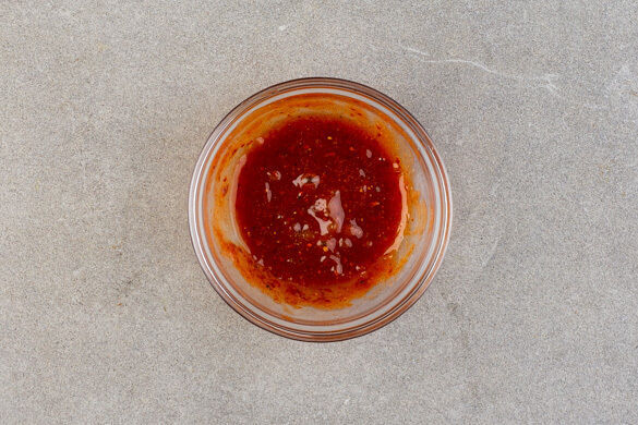 1EL Harissa mit dem Ahornsirup, 2EL Ketchup und 1EL Balsamicoessig zu einem Dip verrühren.