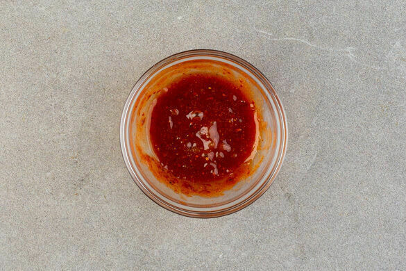 Die restliche Harissa mit dem Ahornsirup, 4EL Ketchup und 2EL Balsamicoessig zu einem Dip verrühren.