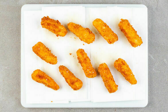 Die Pfanne ggf. auswischen, ca. 0,5cm hoch mit Pflanzenöl befüllen und sehr stark erhitzen. Das Öl ist heiß genug, sobald Pankokrümel im Öl kleine Blasen werfen. Die Grillkäsestifte in der Pfanne auf jeder Seite in ca. 1Min. goldbraun und knusprig braten. Auf Küchenkrepp abtropfen lassen und nach Belieben mit Salz würzen.