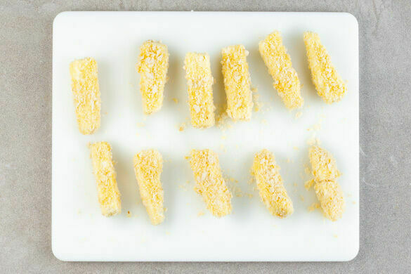 Auf einem tiefen Teller 8EL Mehl mit 2EL Wasser glatt rühren. Auf einem zweiten Teller das Panko-Paniermehl bereitstellen. Den Grillkäse in ca. 1,5cm dicke Stifte schneiden und nacheinander im Teig und im Paniermehl wenden, dabei das Paniermehl ggf. leicht andrücken.