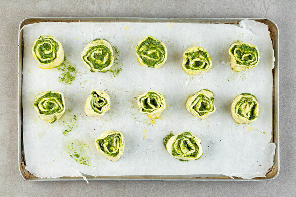 Die Teigrollen in ca. 4cm dicke Scheiben schneiden und diese gleichmäßig auf dem Backpapier verteilen. Auf zwei Backbleche ziehen und die Miniböreks im Ofen in 14–16Min. goldbraun und knusprig backen. Dabei je nach Ofen die Position der Bleche nach der Hälfte der Zeit tauschen. Tipp: Wer mag, kann die Miniböreks vor dem Backen mit verquirltem Ei bestreichen.