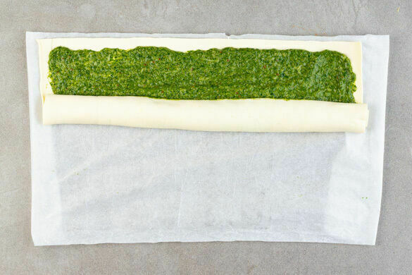 Den Backofen auf 220°C /200°C Umluft) vorheizen. Die Zwiebeln schälen, halbieren und in dünne Streifen schneiden. Mit dem Spinat in einer großen Pfanne mit 2EL Pflanzenöl bei starker Hitze 2–3Min. anbraten. Herausnehmen und mit der ½ der Harissa und 1TL Salz pürieren, dann den Käse unterrühren. Die Teige ausrollen, mit der Füllung bestreichen und aufrollen.
