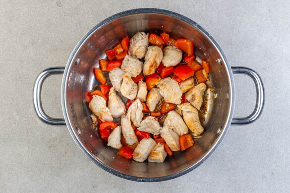 Das Fleisch mit etwas Küchenkrepp trocken tupfen, in ca. 2cm große Würfel schneiden und großzügig mit Salz und Pfeffer würzen. Das Fleisch und ¾ der Paprika in einem großen Topf mit 2EL Olivenöl bei mittlerer bis starker Hitze 2–3Min. anbräunen.