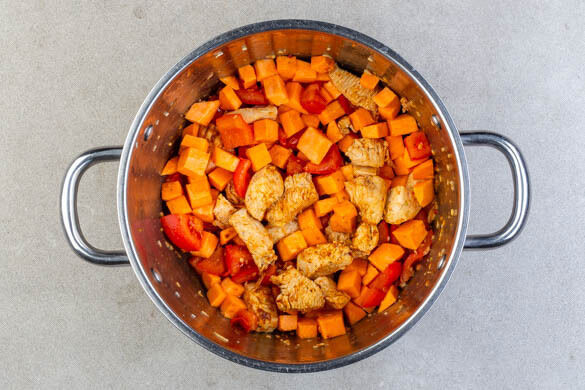 Die grob gewürfelten Tomaten, die Gewürzmischung und den Knoblauch mit je 1 kräftigen Prise Salz und Pfeffer und 1 Prise Zucker zugeben und 1–2Min. mitbraten. Die Süßkartoffelwürfel unterheben.