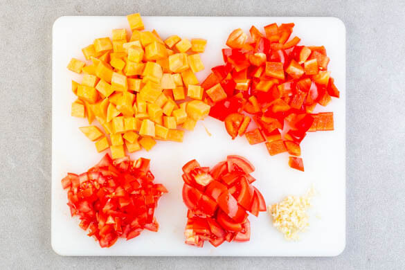 Die Süßkartoffel ggf. schälen und in ca. 1cm große Würfel schneiden. Die Paprika vierteln, entkernen und in ca. 1cm große Stücke schneiden. 1 Tomate grob würfeln, 1 Tomate fein würfeln. Den Knoblauch schälen und fein würfeln.