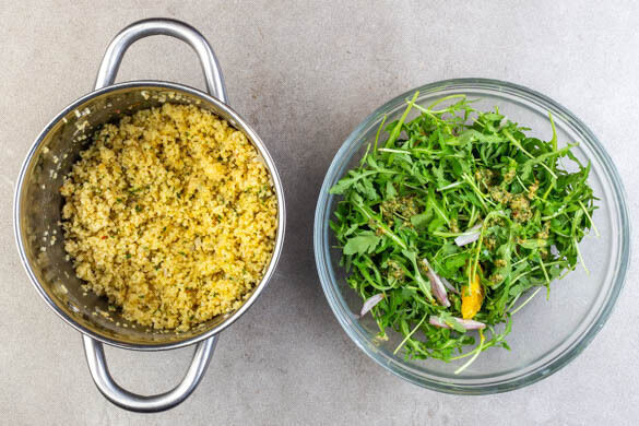 In einem mittelgroßen Topf 600ml leicht gesalzenes Wasser zum Kochen bringen. Den Bulgur in das kochende Wasser rühren und abgedeckt bei niedriger Hitze 5–7Min. sanft köcheln lassen, bis das Wasser aufgesaugt und der Bulgur gar ist. Noch ca. 5Min. ohne Hitzezufuhr ziehen lassen.