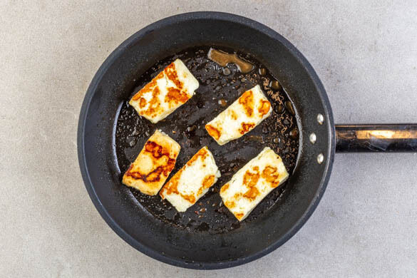 Den Käse trocken tupfen und in ca. 1cm dicke Scheiben schneiden. In derselben Pfanne mit ½EL Olivenöl bei mittlerer bis starker Hitze auf jeder Seite in ca. 2Min. goldbraun anbraten. Aus der Pfanne nehmen und beiseitestellen.