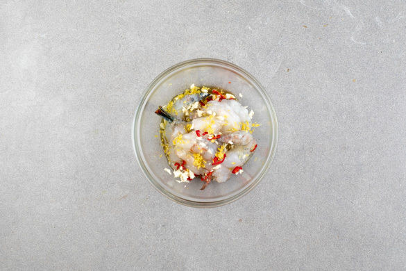 Die Garnelen in einem Sieb mit kaltem Wasser abspülen, mit etwas Küchenkrepp trocken tupfen und mit der Zitronenschale, dem Knoblauch, der Peperoni sowie 2EL Olivenöl vermengen.