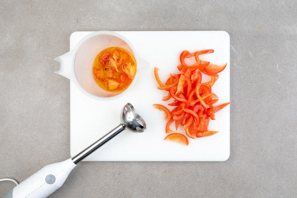 Die Tomaten vierteln. Das Kerngehäuse entfernen, aber aufbewahren. Das Tomatenfruchtfleisch in feine Streifen schneiden. Das Kerngehäuse mit Zitronensaft nach Geschmack und 1EL Olivenöl in einem hohen Gefäß pürieren und mit Salz abschmecken.