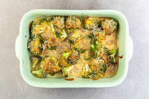 Dieses Gericht fühlt sich an wie eine wärmende Umarmung – nicht zuletzt, weil die Kartoffelspalten und das Brokkoligratin frisch aus dem dampfenden Ofen kommen – und schenkt dir beim Essen wohligen Genuss. Der Brokkoliauflauf kommt mit einer cremigen, herzhaft gewürzten Sauce und einer käsigen Knusperkruste daher, die Ofenkartoffeln sind schön goldbraun und der panierte Fisch herrlich kross. Couch, wir kommen!
