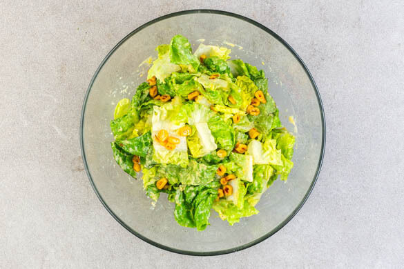 Den Romanasalat mit den gebratenen Maiskörnern und der Vinaigrette vermengen. Den Salat auf Teller verteilen, das Fleisch darauf anrichten und mit dem restlichen Käse garniert servieren.