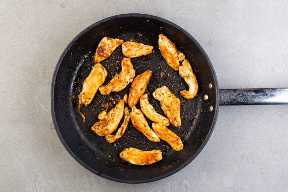 Das Fleisch mit etwas Küchenkrepp trocken tupfen und in breite Streifen schneiden. In einer großen Pfanne mit 3EL Pflanzenöl bei starker Hitze in 4–6Min. rundum goldbraun und gar braten, mit 1½TL Salz würzen.