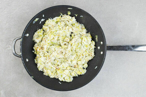 In einem großen Topf 450ml leicht gesalzenes Wasser aufkochen. 225g Reis in einem Sieb kalt abspülen. Den Lauch in ca. 1cm breite Ringe schneiden. ¾ des Weißkohls in feine Streifen schneiden und mit dem Lauch und dem Reis in das kochende Wasser rühren. Abgedeckt bei niedrigster Hitze 12–14Min. kochen, bis der Reis gar ist. Noch ca. 5Min. ohne Hitzezufuhr ziehen lassen.