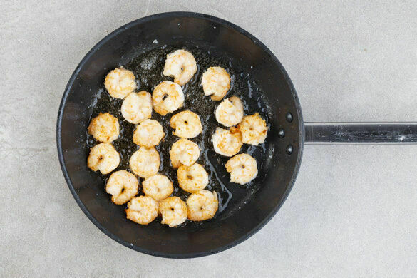 Eine dünne Schicht Pflanzenöl in einer zweiten großen Pfanne stark erhitzen. Das Öl ist heiß genug, sobald sich kleine Bläschen bilden, wenn man einen Holzlöffel hineinhält. Die Garnelen in das heiße Öl geben und auf jeder Seite ca. 1Min. braten, bis die Garnelen goldbraun und knusprig sind.