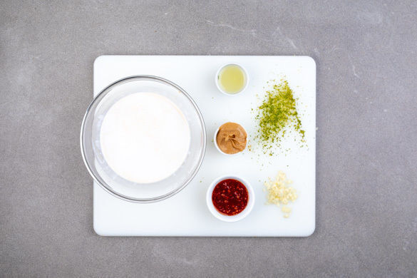 Den Knoblauch schälen und fein würfeln. Die Limettenschale abreiben, dann die Limette halbieren und auspressen. Den Knoblauch mit der Kokosmilch, 1TL Limettenschale, Limettensaft nach Geschmack, der ½ der Sweet-Chili-Sauce, der ½ der Sojasauce, der Erdnussbutter und 75ml Wasser verrühren.