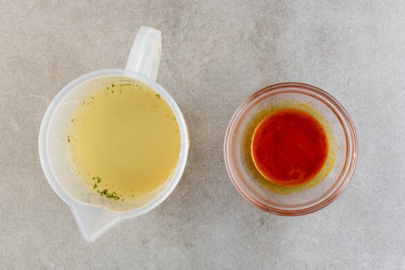 Das Brühgewürz in 1,2L heißem Wasser auflösen. Die Safranfäden mit 1 Prise Salz mit einem Löffel zerreiben oder in einem Mörser fein zerstoßen und anschließend in ca. 2TL heißem Wasser auflösen.