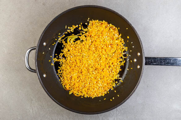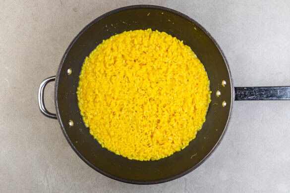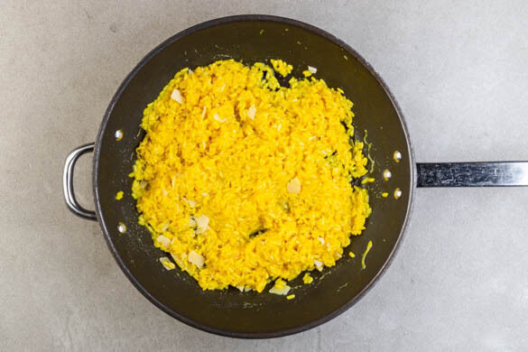 Die Zwiebeln in einer großen Pfanne mit 1½EL Olivenöl bei mittlerer Hitze ca. 2Min. glasig anbraten. 300g Reis und den Knoblauch dazugeben, kurz mitrösten, dann mit dem Safranwasser ablöschen und weitere 1–2Min. braten.