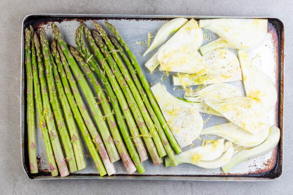 Zwischendurch die Zitronenschale abreiben, dann die Zitrone in Spalten schneiden. Den Spargel und den Fenchel auf einem Backblech mit 2EL Olivenöl und der Zitronenschale nach Geschmack vermengen und mit je 1 kräftigen Prise Salz und Pfeffer würzen. Im Ofen 10–15Min. grillen, bis das Gemüse goldgelb und leicht knusprig ist.