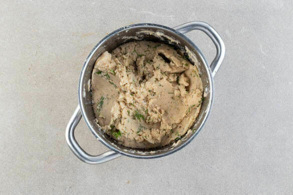 Die Walnüsse in einer mittelgroßen Pfanne ohne Zugabe von Fett bei mittlerer Hitze 3–4Min. anrösten. Vorsicht, sie können schnell zu dunkel werden. In ein hohes Gefäß geben, kurz abkühlen lassen, dann den Knoblauch, 200ml Brühe und 3–4EL Zitronensaft zugeben und alles mit einem Stabmixer möglichst glatt pürieren.
