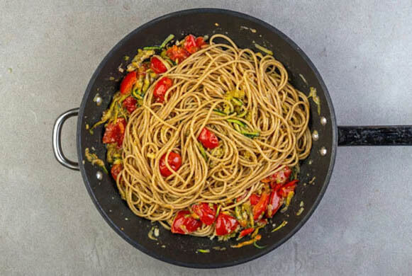 Die Tomaten, den Knoblauch und die Gewürzmischung in die Pfanne geben und ca. 4Min. mitbraten. 150ml Pastawasser und den Zitronensaft einrühren, die Hitze erhöhen und alles köcheln lassen, bis die Sauce eindickt. Die Pasta untermengen und kräftig mit Salz und Pfeffer würzen, ggf. mehr Pastawasser zugeben.
